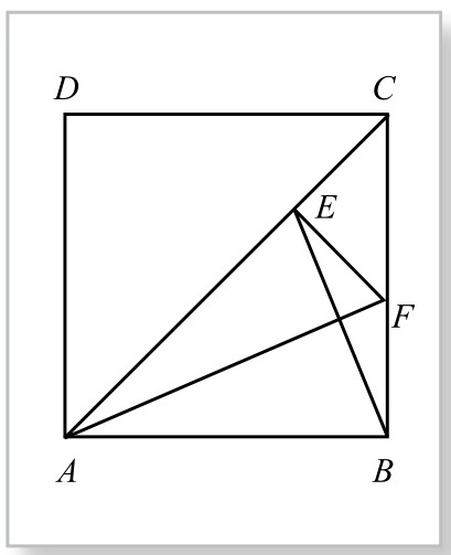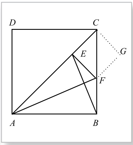 但是,该学派中有个叫希帕苏斯的成员,发现正方形的对角线与其一边却不可公度。事实上,如图2-2-2所示,在正方形ABCD中,用一边AB来量对角线AC,使AE=AB,剩余为CE。作∠BAC分角线AF,交BC于F,连接AF,则易知△AEF≌△ABF(SAS),而有EF=BF,且∠AEF=∠ABF=90°,于是∠CEF=90°。又因∠ECF=45°,故∠EFC=45°, CE=EF, △CEF为等腰直角三角形,于是CE与CF又成为另一个小正方形CEFG的一边与对角线,如图2-2-3所示。因此,又回到原来的问题:用正方形的边来量它的对角线。如此便出现循环往复,以至于无穷的困境。也就是说,正方形的边与对角线,二者不存在公度线段,即正方形一边与对角线是不可公度的。