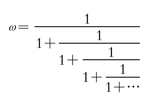 由上式可得x(x+1)=1, ,若将分母中的x用其分式表示式带入,便得一繁分式,再一步步迭代,便得到黄金数的连分数表示式: