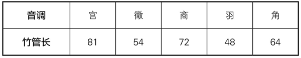 将此竹管长度定为81(等分),按照“三分损益”方法,得到十二个长短不同的竹管。用它们吹出音调,分别得到高低不同的“六吕”“六律”共十二个音调(构成一个完整的音程)。具体方法是:将黄钟(宫)竹管截去(损)三分之一,得到长54的竹管,用它吹出的音调定“林钟”(徵)。再将此竹管增加(益)三分之一,得到长72的竹管,吹出的音调,定为“太簇”(商)。继续损去三分之一,得到长48的竹管,吹出“南吕”(羽)。再三分益一,得到长64的竹管,吹出“姑洗”(角)。上述损益过程列表如下:
