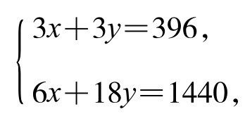 例3.在我国清代的一部小说《镜花缘》中,第93回有“米兰芬妙算灯球”一事,含有数学的妙趣,历来为人们所欣赏。故事说的是,众才女在宗伯府观灯,灯上都挂着灯球。楼下的灯球有两种形状,一种是大球下缀2个小球,另一种是大球下缀4个小球,共有大球360个、小球1200个。楼上的灯球也有两种,一种是3个大球下缀6个小球,9个球结为一灯;另一种是3个大球下缀18个小球,21个球结为一灯。共有大球396个、小球1440个。问楼上楼下各有多少盏彩灯?