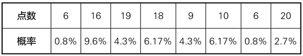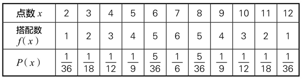 四颗骰子的点数,共有21种情况:从4点到24点。但每种情况出现的机会并不相同。为了研究方便,先研究两颗骰子的情况。两颗骰子点数的搭配,共有36种情况,由此可以计算出现各种点数的概率:我们用P(x)表示出现x点的概率,则有表3-2-3: