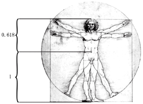 自从黄金比例被发现之后,欧洲绘画与数学产生了更密切的关系。特别经过大艺术家达·芬奇大力提倡,人们将比例,特别是黄金比例广泛用于人体绘画中。他说:“美感完全建立在各部分之间神圣的比例关系上。”并详细指出人体各部分的比例。例如人体的肚脐位置,是全身的黄金点,人体各部分也都有一定的比例(图3-2-4)。