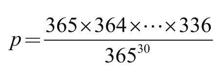 在30人中有两人生日相同的机会究竟有多大呢?我们来计算一下。