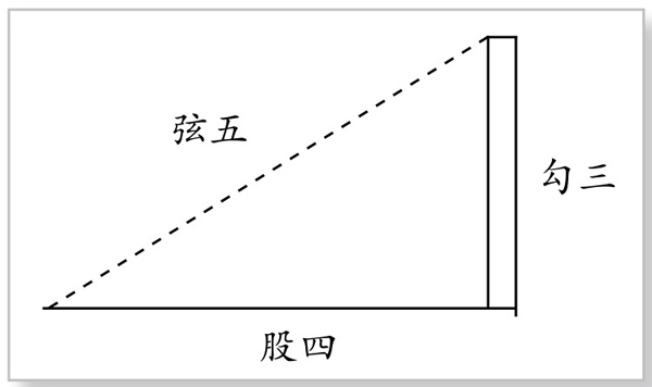 矩可以用来画直角和垂线。矩不同于现在画图用的三角板,它是由两根木条制作而成,并构成直角的曲尺,没有斜边。如图4-2-1所示,将其中较短的边称为“勾”,较长的边则称为“股”。只有当这两边构成直角时,才能准确测量高低远近。如果不垂直,那么用其来测量,便会差之毫厘,失之千里。那么怎样才能保证“勾”与“股”这两边构成直角呢?这是个非常困难的问题。