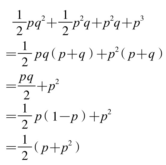 男性中正常和色盲两类,以F、S表示;女性中正常、次正常和色盲三类,分别以Z、C、K表示。则F、S在男性中所占比例分别为q、p(q=1-p);Z、C、K在女性中的比例,分别为q2、2pq(因为女性有两个X ,可以任选一个)、p2。因此,男女色盲数占总人口数的比例为:(p+p2)。