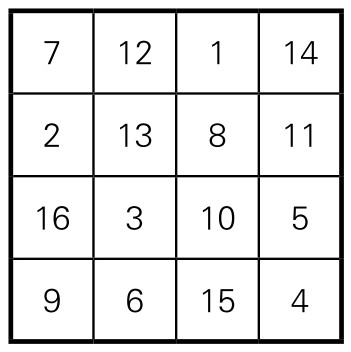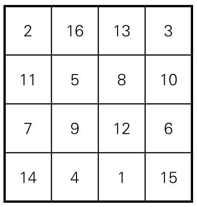 1.它首先是一个幻方,具有幻方的所有性质。它每行、每列和两条主对角线数字之和都等于34。