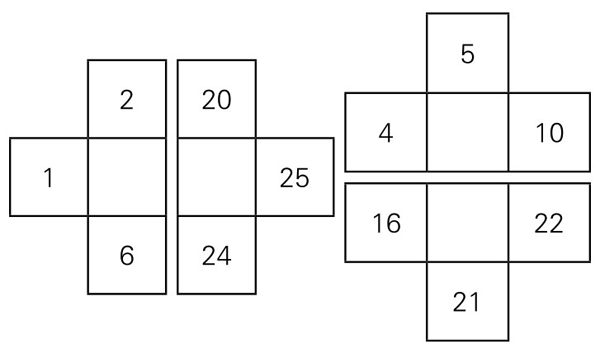 第四步,将这四个小图对换位置(左右对换,上下对换),并将其中的数字,按照相应的顺序,填入到大图的空格中,如图5-1-12。这样便完成了一个五阶幻方的编制,如图5-1-13。