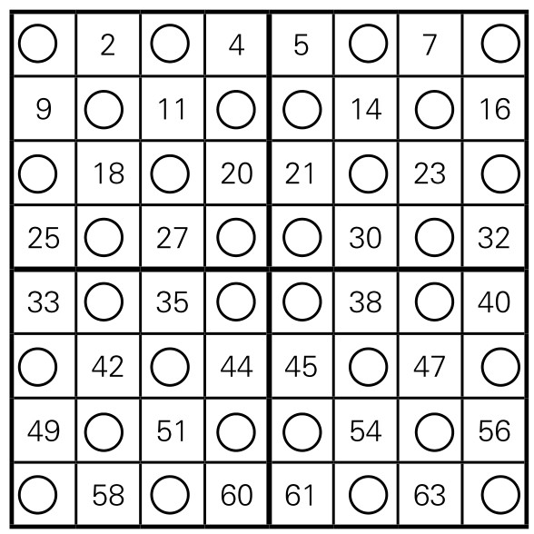 第四步,从左上角第一格开始,依次写数字1, 2, 3, ……直到64。但凡是有“○”处,跳过去不写。如图5-1-14,图上有一半格子填入了数字,一半格子是圆圈。