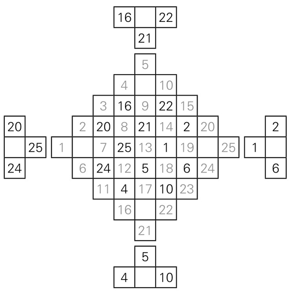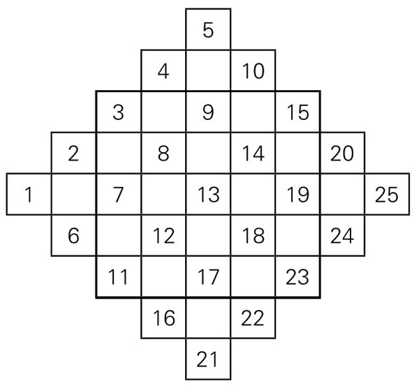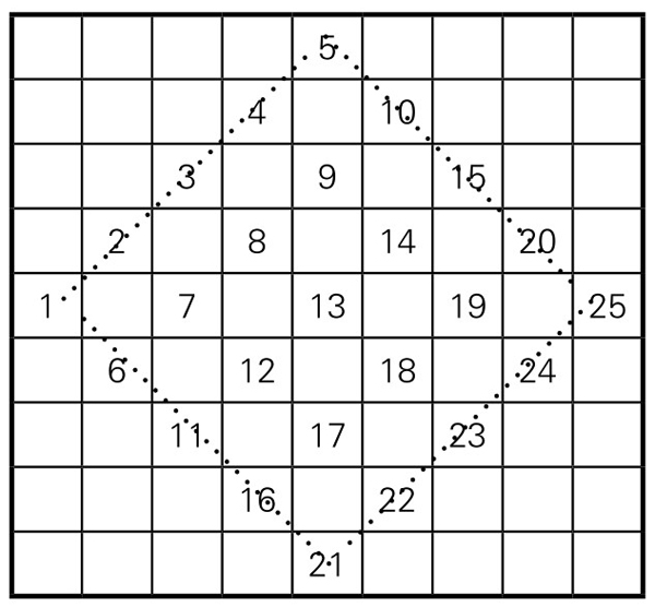 第一步,在中间的内接菱形的格子里(包括边线上的格子),从左边中间一格起,在菱形的格子里,依次写入1, 2, 3, …, 25,如图5-1-9。