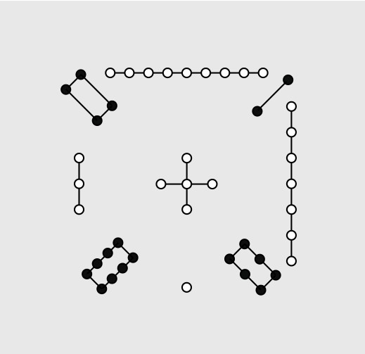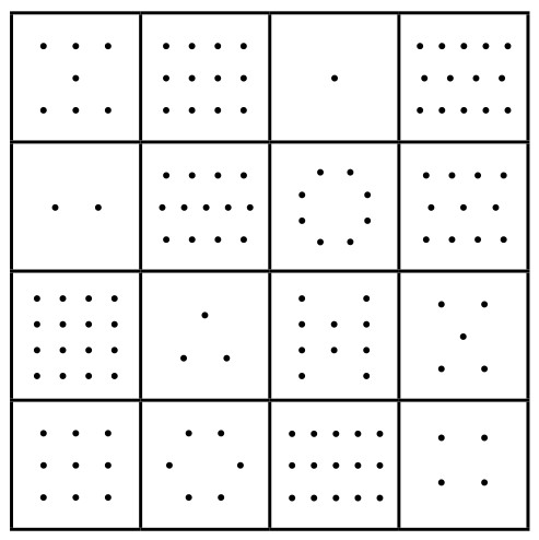 我们或许可以用图画来表达地球人的面貌和情况。但如何反映地球人的聪明才智呢?当时我国数学家华罗庚提出一个绝妙的想法:用点子表示数目,画一个四阶完美幻方,即如图5-1-6所示。如果把图中的点子数目,换成数字,它便是如图5-1-7所示的四阶数字幻方。