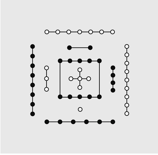 第三步,将此画过圆圈的小方阵,上下、左右对称地反射到其他三个四阶小方阵上。这样整个八阶方阵上的小圆圈有32个,正好占据一半格子,而另一半为空格。
