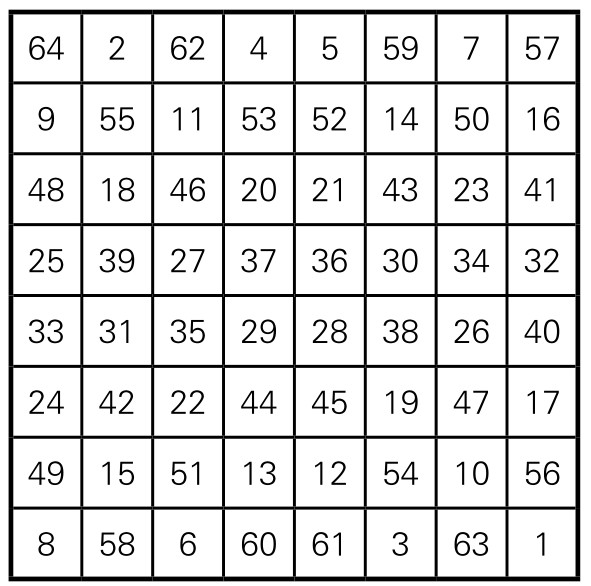 第五步,从方阵的右下角开始,再依次填写1, 2, 3, ……直到64。不过,跳过已经填有数字的格子,仅在“○”处填数字。这样做的结果如图5-1-15, 64格都填上了数字,且64个数字不重复。这样填出的方阵,就是一个八阶幻方。