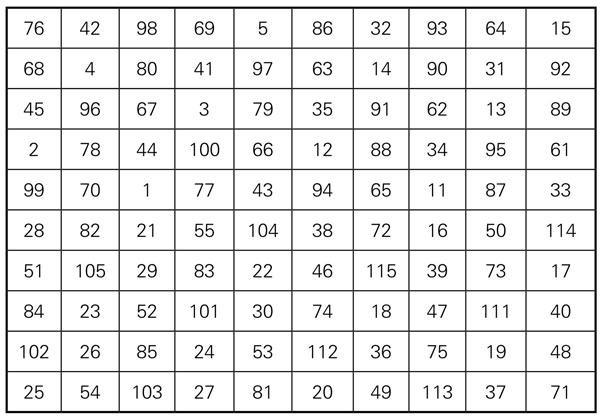 幻方诞生在中国,后来才传入西方。但是现在世界各地,都有不少幻方的研究者和爱好者。有世界性的幻方组织、幻方协会、幻方刊物。中国也有很多幻方研究者和爱好者,成立了“中国幻方协会”,并出版杂志《中国幻方》。我国还有研究者创造过不少新的幻方。如安徽芜湖市的杨弋,在他年仅六岁时,就因巧解“八阶双重幻方”的最小和,而获得了中央四部委授予的“21世纪之星”称号(百名之一)。他还创制出了十阶完美幻方(图5-1-16)。
