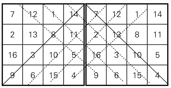 2.若把两个幻方并起来,如图5-1-8,除了两条主对角线(用实线表示)外,还有六条斜对角线(左右各三条,用虚线表示),其上的数字之和也是34。