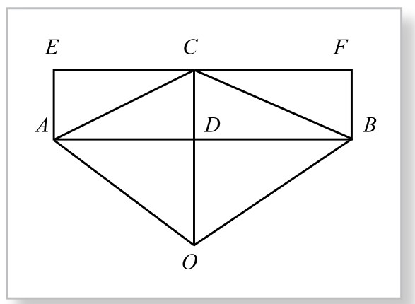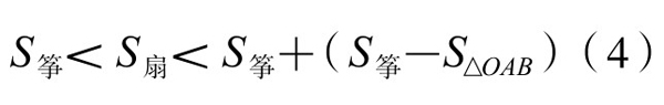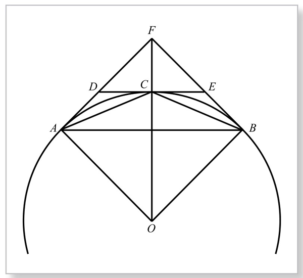 在图5-4-3中,设AB为圆内接正96边形的一边,AC=BC为圆内接正192边形的相邻的两边,EF为过C点的切线,ABFE为矩形,OC=OA=OB为半径。显而易见,扇形O-ACB的面积S扇界于筝形OACB面积S筝与五边形OAEFB的面积SOAEFB之间: