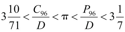 他发现的这两个递推公式是很高明的。这样就能从正6边形开始,利用这两个递推公式,倍增圆内接和外切正多边形的边数,依次计算得圆内接、外切正12、24、48、96边形周长序列(1),从而得到,其中D是圆的直径。由此求得圆周率π的近似值,以及其上界和下界。如果取π精确到0.01的近似值,那就是π≈3.14。
