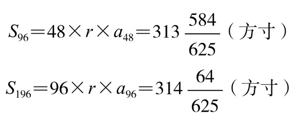 为了求出这些多边形的面积,他设圆的半径为1尺,用勾股定理算出它们一边之长a12, a24, a48, a96。仿照上面的办法,用筝形面积公式算出圆内接正96边形和内接正192边形的面积: