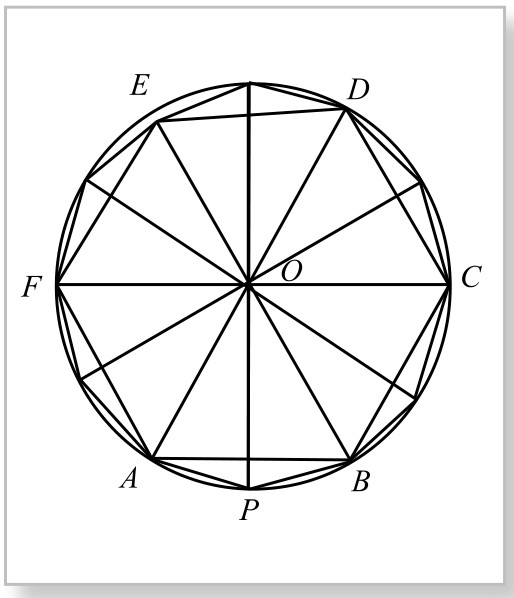 现将圆内接正6边形“割”成正12边形。其中四边形OAPB是筝形,它的两条对角线AB和OP互相垂直且都等于半径r,它的面积等于×AB×OP=