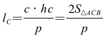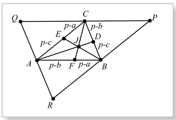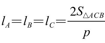 过A、B、C分别作对边平行线,交成△PQR,如图5-5-2。且设J到PQ、PR、QR距离分别为lC, lB, lA;J到AB的距离为hc,则 。因此,