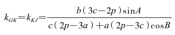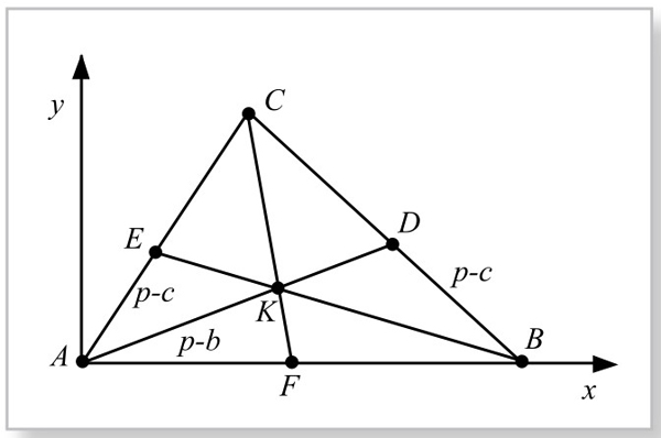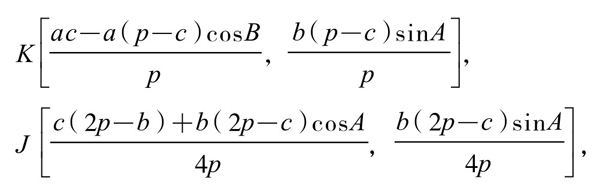 他在事先证明定理1、2时,以A点为原点,以AB为x轴正向,建立直角坐标系(图5-5-1)。设三角形三边长分别为a, b, c;设p为三角形半周长,则可求得点K、J的坐标,分别为: