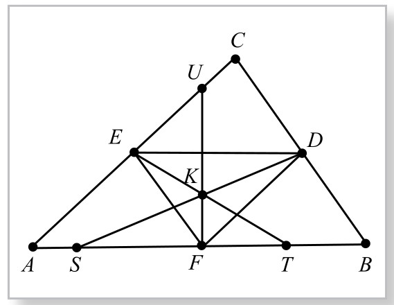=EF(△ABC中位线),又因为DF∥AC,故有∠EFU=∠EUF=∠DFU,因而FU为∠DFE分角线。同理。可证SD、TE分别是∠EDF、∠DEF分角线。因此,这三条等周线DS、ET、FU交于△DEF的内心K,即K点也是唯一存在的。但显然△DEF与△ABC也为逆对称,其对称中心也是二者的公共重心G,故此两个三角形的内心关于G点为逆对称点,即K、G、I在一条直线上。