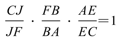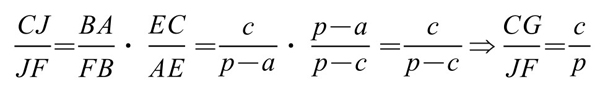 在“陈证”中,将三角形的等周中心,称为三角形的“界心”。先证第一界心J(上述的K点)存在。即从三角形三顶点出发的分周线共点。从图5-5-2上看,直线BJE截△ACB,由梅涅劳斯定理知:。若设三边AB=c, BC=a, AC=b, p为半周长,则AF=CD=p-b, BF=CE=p-a, AE=BD=p-c,从而