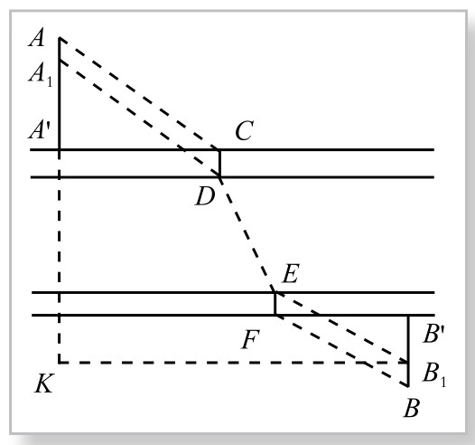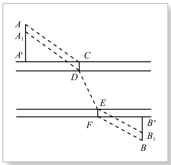 思考一:设在小河甲上建造桥CD,在小河乙上建造桥EF,则在A、B间来往的路线是折线ACDEFB。若在AA′上取AA1=CD,在BB′上取BB1=EF,连接A1D、EB1,那么,除了桥以外,从A到B在陆地上走的路程,应是折线A1DEB1。因为两座桥的长度是不能减少的,所以A、B间路程的长短,决定于这条折线的长短。显然,当且仅当A1DEB1成一条直线时,从A1到B1有最短距离,因而A、B间有最短距离。这时A1B1与甲河北岸的交点D1,就是甲河的桥址,与乙河南岸的交点E1,就是乙河的桥址。
