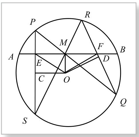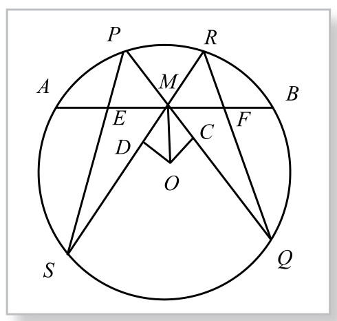 命题1.(坎迪定理)圆O中,设M为弦AB上的任意一点,过M任作二弦PQ、RS,分别交AB于E、F,则