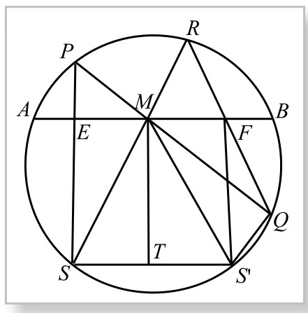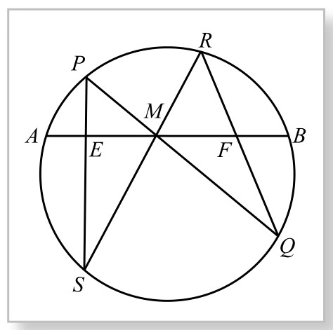 1815年,西欧《女士与绅士日记》杂志上刊登一道数学证解题(见书末参考文献[10]P640),引起人们广泛兴趣。题目如下:如图5-11-1,过圆中弦AB中点M任作二弦PQ、RS,设它们分别交圆于P、Q、R、S。连接PS、QR,分别交AB于E、F,证明EM=FM。