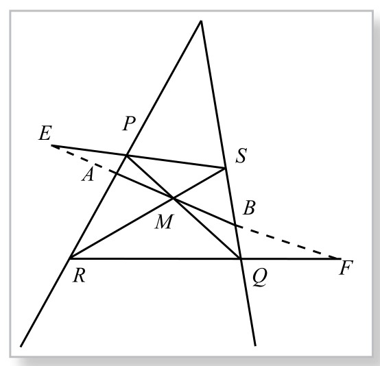 命题3.设l1、l2是两条相交直线或平行直线(图5-11-6、5-11-7)。A、B分别在此二直线上。M为AB的中点。过M任作二直线,分别交l1、l2于P、Q、R、S四点,连接PS、QR,交AB或其延长线于E、F,那么ME=MF。