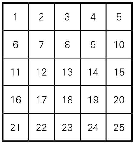 但并不是任何阶的序方都能够进行等值分块。例如,五阶序方(图5-14-8)则不能进行任何等值分块。事实上,五阶序方中所有数字之和为13×25=325,如果可以等值分块的话,只能分为5块、13块或25块;5块的值是65,13块的值是25, 25块的值是13。但是25与其邻近的几个数字之和,都不可能为65,因此含有25的一块,它的值无论如何都不可能是65,更不可能是13。同样,含有24这一块的值也绝不可能是25。