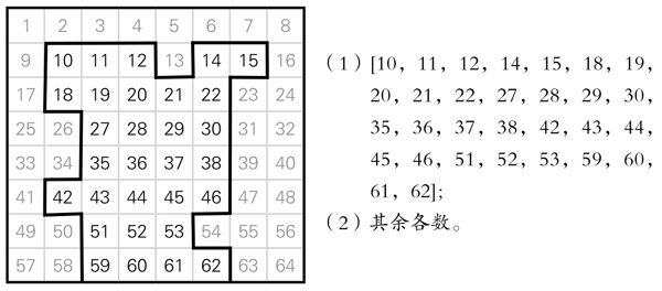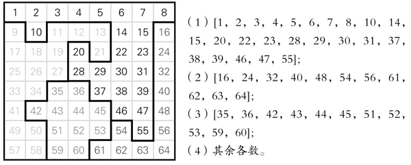 因为八阶序方所有数字之和是2080,所以八阶序方如果可以等值分块的话,可能存在多种分块法,如下表5-14-1所列: