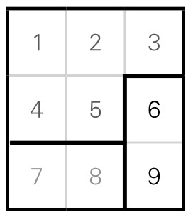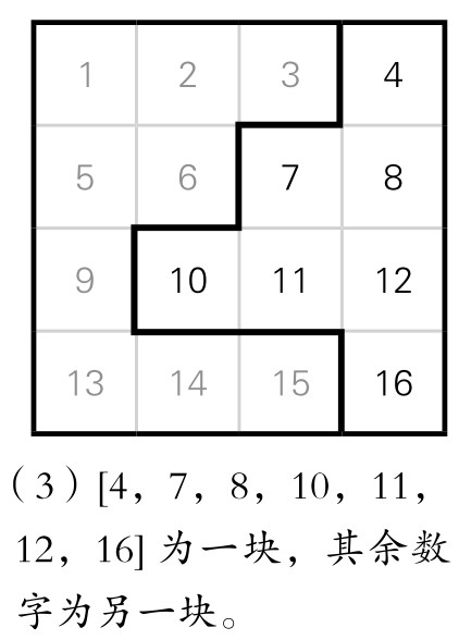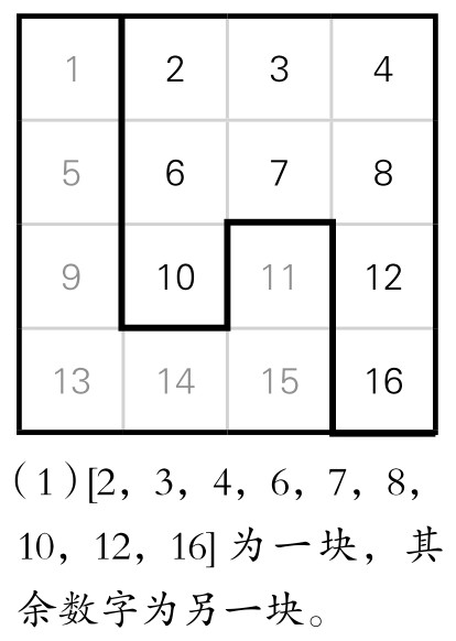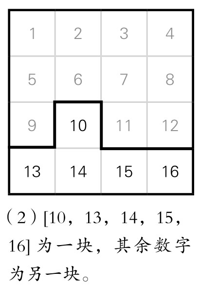 其二,序方分块中的每一块,尽管可以形状各异,但要求都是要连通,亦即同一块的所有数字都彼此相连。