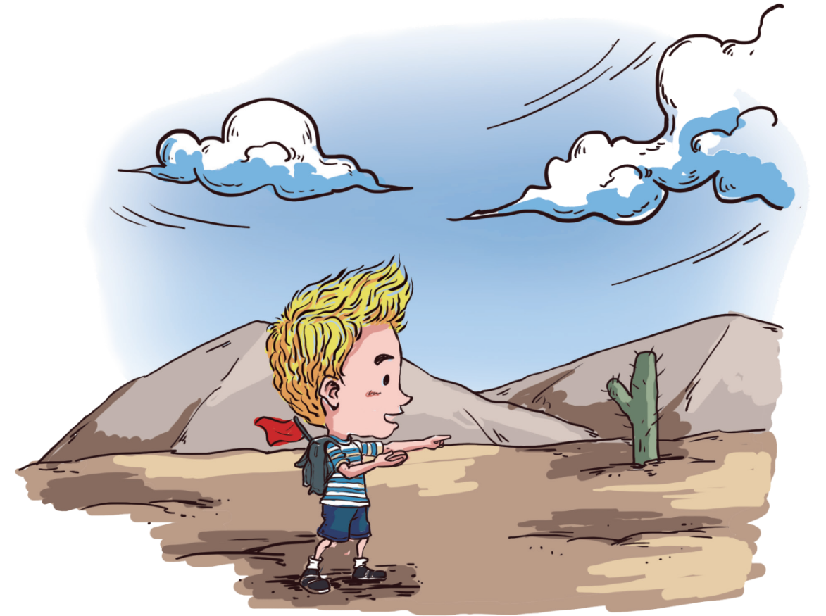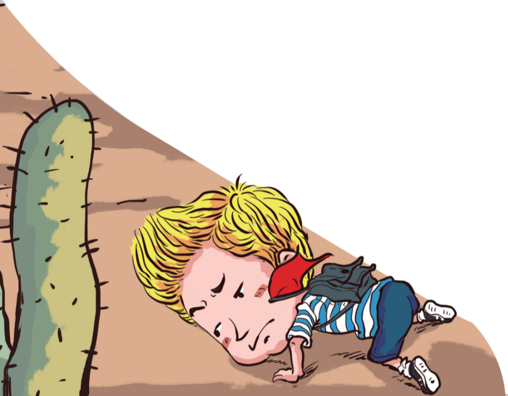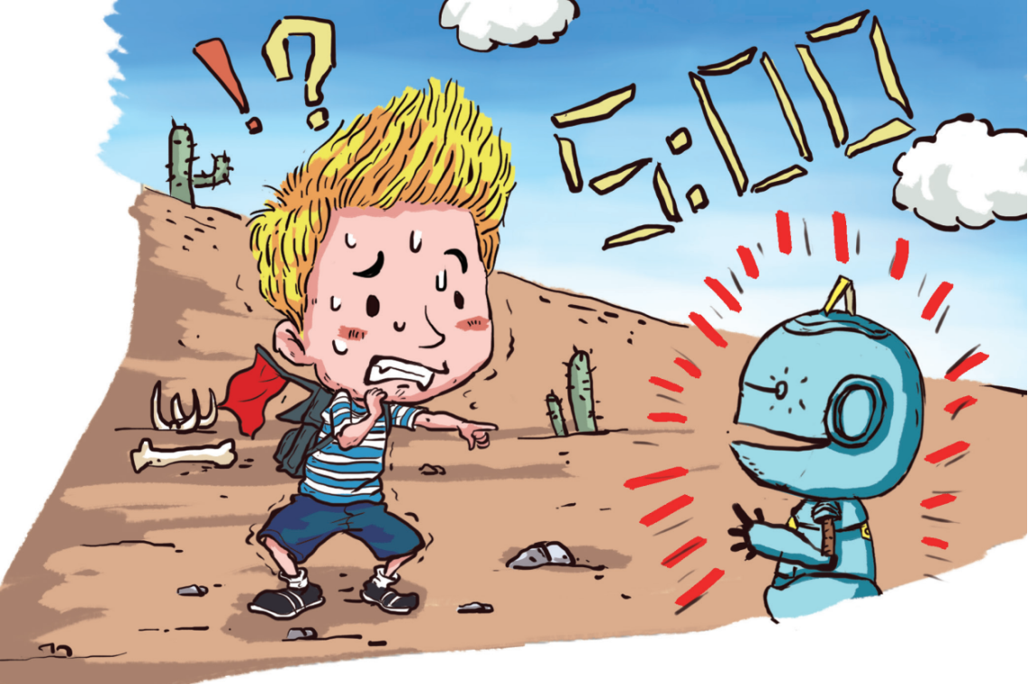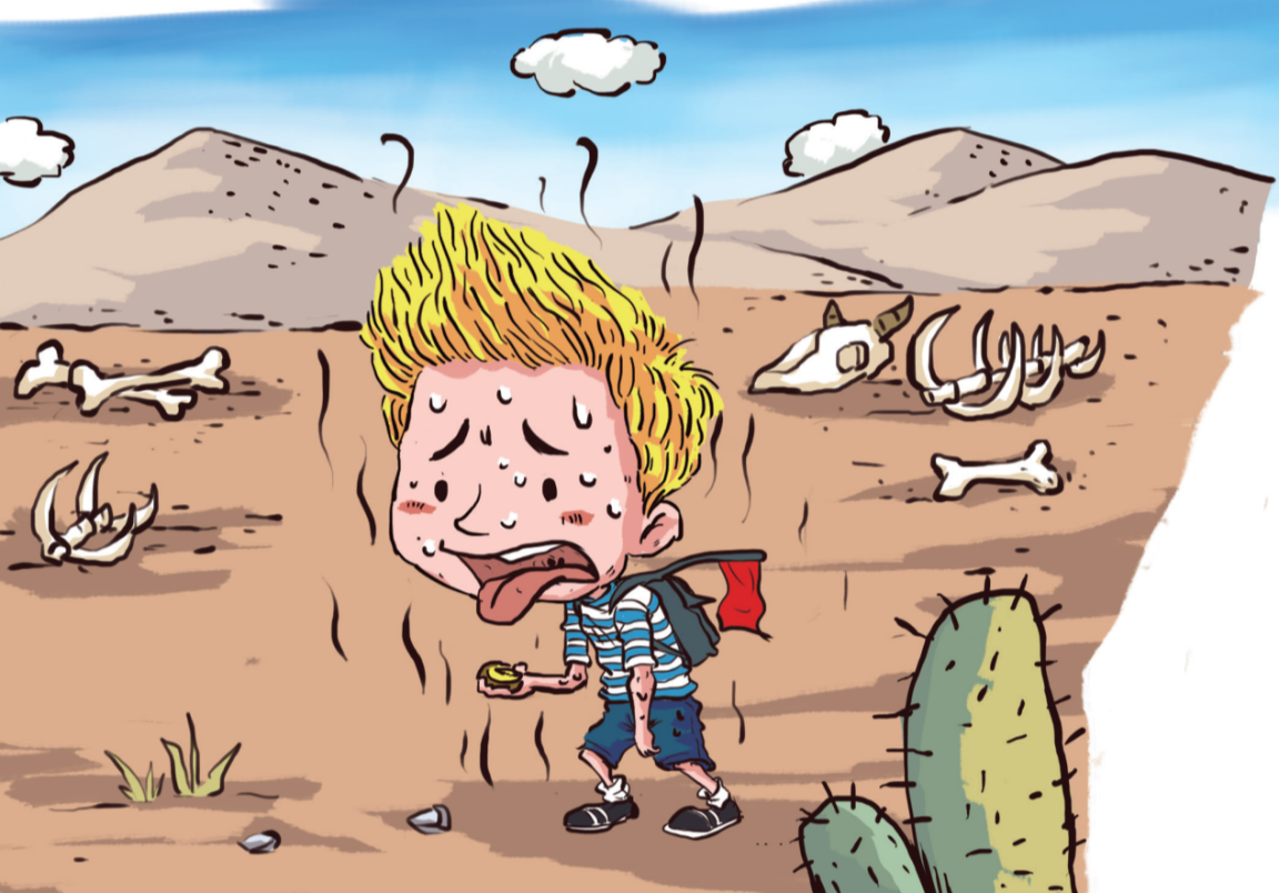 他又热又渴,却不敢喝掉杯子中剩余的冰茶(已经被太阳晒成热茶了),要知道在沙漠里行走,空旷的四周没有标志物,看似笔直的路线,其实随时都会走偏,所以艾拉还要不断地用刚制作的指南针辨别方向。