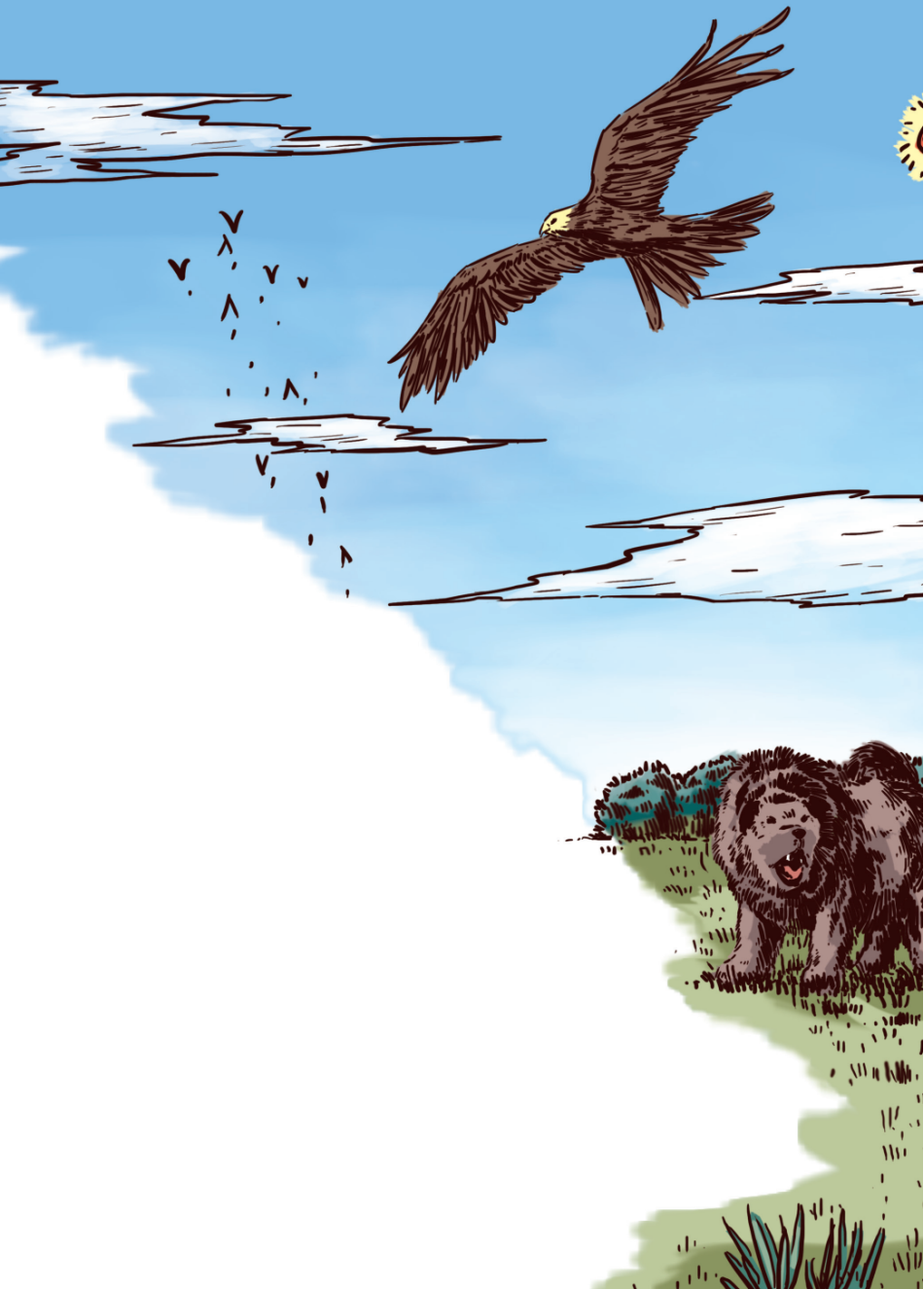 “小伙子,挺直你的腰杆!挥动鞭子,勇敢一点儿,快跑!”朱玛对着在大黑马背上哆哆嗦嗦的艾拉大声喊。