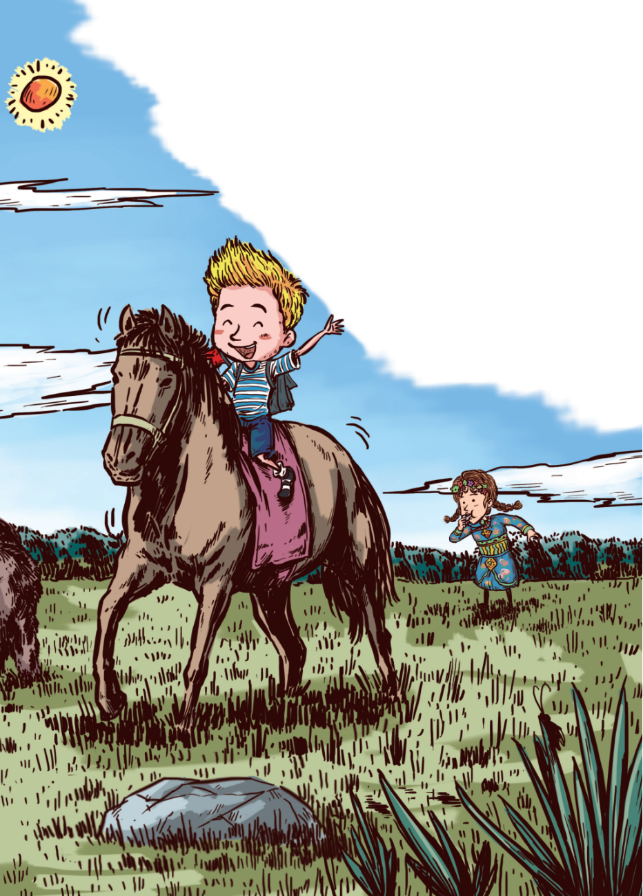 “我会骑马啦!哈哈……”艾拉兴奋地在马背上呼喊着,还会牵动缰绳让大黑马转头往回跑了呢!
