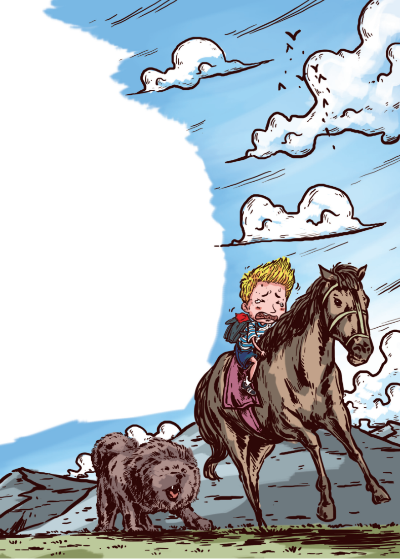 马背上的艾拉可真是吓坏了,抱着大黑马的脖子都要哭出来了:“不要跑!停下来!停下来!”