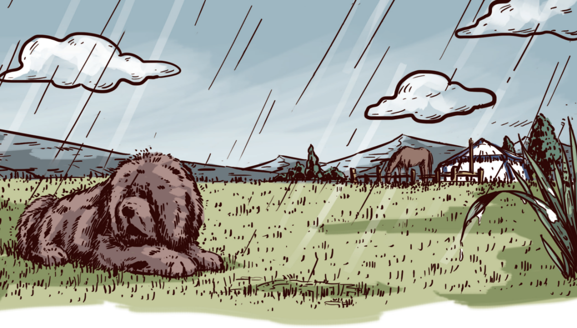 此时下起了倾盆大雨,青藏高原的雨点像冰水一样寒冷。朱玛必须去招呼受惊的羊群了,连大黑马都躲进了马圈,只有藏獒虎子陪着艾拉,在雨中继续翻找着一片片草地。