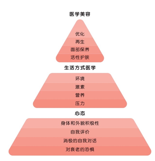 第一层级:心态。心态是基石。在攀登这座金字塔之前,健康的心态有多重要,我再怎么强调都不为过。这里不仅涉及你对变老这件事的态度,也涉及在此之前你对照镜子时引发的情绪的处理方式。可能你的生活方式非常健康,你也在做皮肤护理和面部保养,甚至打过美容针,但是如果你的心态没有端正,不管做什么都不会让你产生美好的感觉。