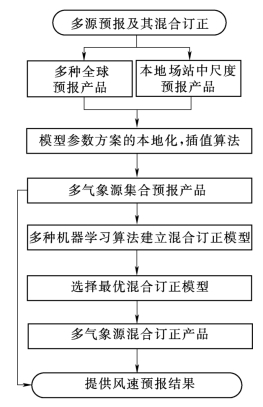 基于美国全球预报系统 (globle forecast system,GFS)以及ECMRF、欧洲中心集合预报产品和本地运行的风电确定性中尺度数值预报的分辨率和特征,综合考虑本地业务模式运行环境和资源条件,本地化区域模式参数方案,同时利用反距离加权、克里金插值等统计学插值方法,生产针对清洁能源电站级的多气象源集合预报,为功率预测提供丰富的天气预报数据。基于清洁能源电站级的多气象源集合预报资料,利用弹性网络、K 近邻点、支持向量机、线性回归等多种机器学习算法,建立多种混合订正模型,通过模型选择和均方根误差评价等方法选择最优模型,对多气象源集合预报进行混合订正,最终输出一种多气象源混合订正产品。气象同化技术流程图如图2-5所示。
