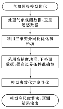 基于实时卫星遥感数据、气象站观测数据、风/光电站气象观测数据,结合欧洲中期天气预报中心 (European Centre for Medium-Range Weather Forecasts,ECMWF)全球预报背景场数据,利用三维变分、集合卡尔曼滤波等数据同化算法,生成更符合实际的模式初始气象场。采用高分辨率和更准确的地形高度数据、下垫面类型数据,提高模型下边界条件的准确性。通过调整边界层过程、近地面过程、陆面过程、短波辐射过程等参数化方案,进行大量敏感性试验,并且调整方案的内部参数值,找出最适合本地区的参数化组合方案。利用反距离加权、克里金插值等方法,进行优化气象模型结果的降尺度后处理,使得预报结果更符合清洁能源电站所在区域的实际值。气象同化技术流程图如图2-4所示。