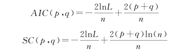 式中 AIC(p,q)、SC(p,q)——lnL 模型的对数似然函数值;