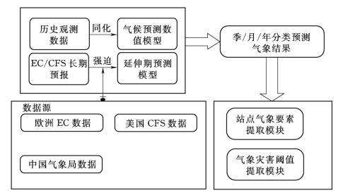(1)气候/延伸期预测模型。基于成熟的不同时间尺度数值模拟模型,根据初始场和强迫场数据,结合观测资料同化技术对区域进行模拟。初始场数据来自场站观测及公开气象站,强迫场数据来自欧洲数据预报中心 (European Center for Medium Ranger Weather Forecasts,ECMWF)(简称EC)及美国国家环境预报中心气候预报系统 (climate forecast system,CFS)的数据,数据结果具有权威性和可靠性。