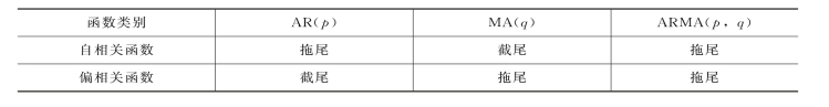 由表2-2所知,当偏相关函数在有限阶数内截尾,即偏相关函数在p 阶衰减至零,自相关函数拖尾,即自相关函数呈衰减性时,此序列适合建立AR(p)模型;当偏相关函数拖尾,自相关函数在有限阶数内截尾,即自相关函数在q 阶衰减至零时,此序列适合建立MA(q)模型;当偏相关函数和自相关函数均拖尾时,此序列适合建立ARMA(p,q)模型。