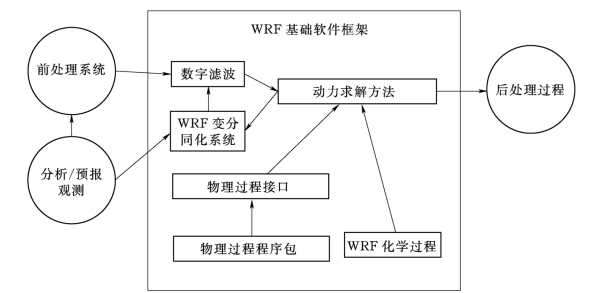 美国国家环境预报中心 (National Centers for Environmental Prediction,NCEP)、美国空军、美国国家海洋和大气管理局 (National Oceanic and Atmospheric Administration,NOAA)等联合开发的下一代WRF具有非静力平衡、高分辨率和完全可压缩的特点,对各种中小尺度天气系统都具有较强的模拟能力。模式坐标采用地形跟随坐标,水平方向采用Arakawa-C网格,在时间积分上采用Runge-Kutta的3阶积分方案,分辨率精度较高。物理过程包括大气水平和垂直涡动扩散、大气短波和大气长波辐射方案、边界层方案、陆面方案、云物理参数化方案和积云对流。WRF模式流程图如图2-6所示。
