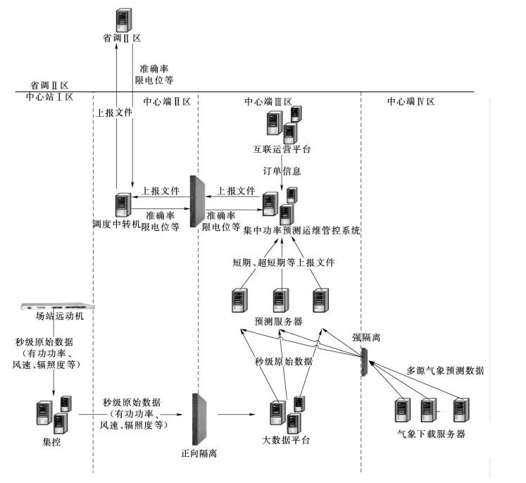 集中功率预测系统界面分为3个板块,即查询条件、曲线图形展示、数据表格展示。其中以图形展示的方式为主,不同颜色的曲线代表不同预测厂家在选定时间内对选定区域内场站的预测功率及其与实际功率的对比,从而来反馈各预测厂家对区域内场站预测的准确性。