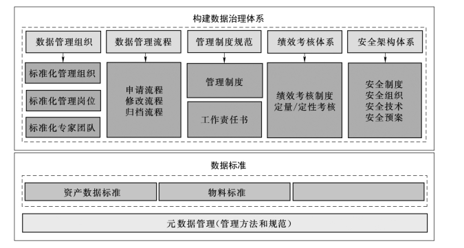 (1)建立电力公司及各电厂数据治理体系,包括数据管理组织、数据管理流程、管理制度规范、绩效考核体系以及安全架构体系5个方面。