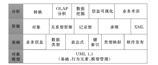 目前国际上元数据管理遵循的规范为公共仓库元模型 (common warehouse model,CWM)。该规范是由对象管理组织 (object mangement group,OMG)制定的,此规范的目的是在不同系统之间可以自由、便捷地交换元数据。CWM 的核心技术有三个,分别是统一建模语言 (united modeling language,UML)、元数据对象建模 (metadata object facility,MOF)和元数据交换文件 (XML metadata interchange,XMI)。UML主要用来定义元模型;MOF用来提供可操作的元数据接口;XMI用来定义交换元数据的机制,元数据规范如图3-32所示。
