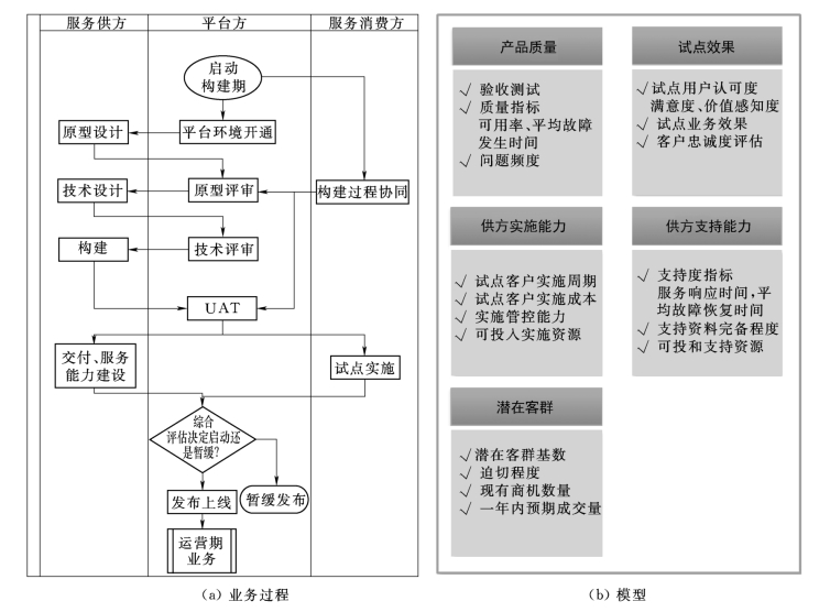 构建期运营业务过程中的核心活动是对于已构建产品是否能够发布上线进入正式运营期进行评估。评估模型主要包括产品质量、试点效果、供方实施能力、供方支持能力、潜在客群等几个维度。
