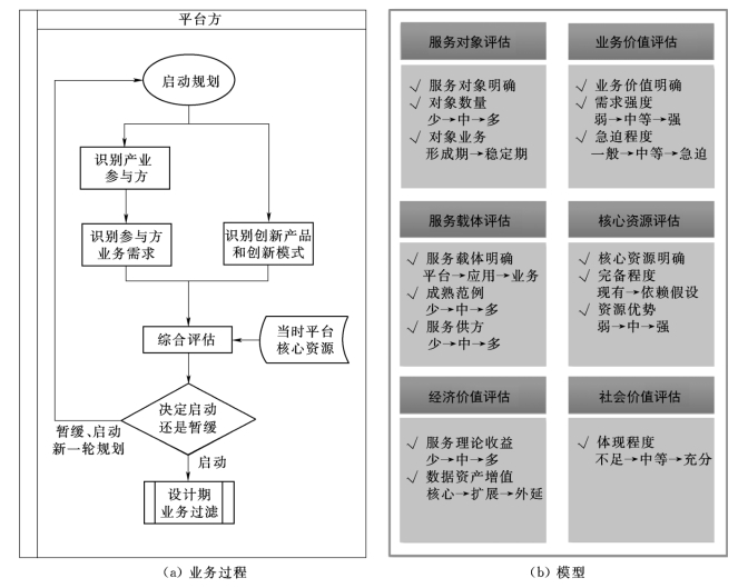 规划期运营业务过程中的核心活动是对规划服务产品的评估,评估模型主要涉及三个维度:对于服务消费方的业务价值是否足够;创新平台核心资源是否足够支持服务产品形成差异化的竞争力;这项服务产品对于创新平台的价值是否足够。